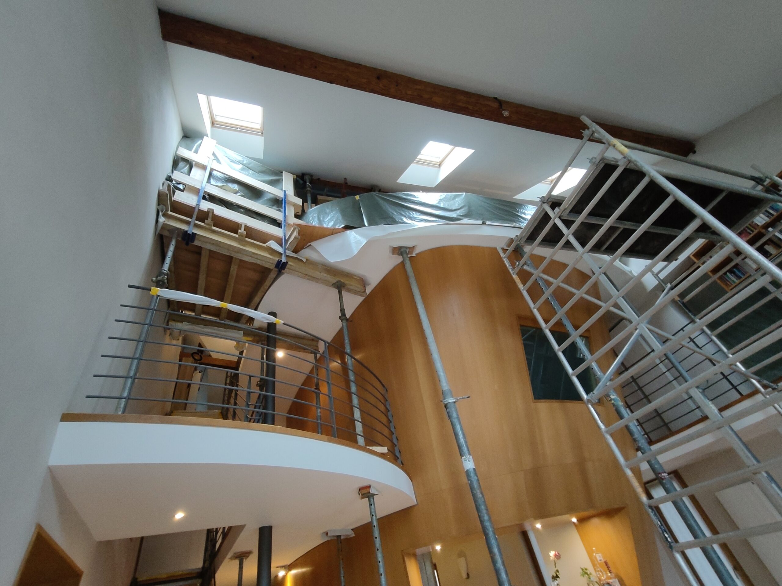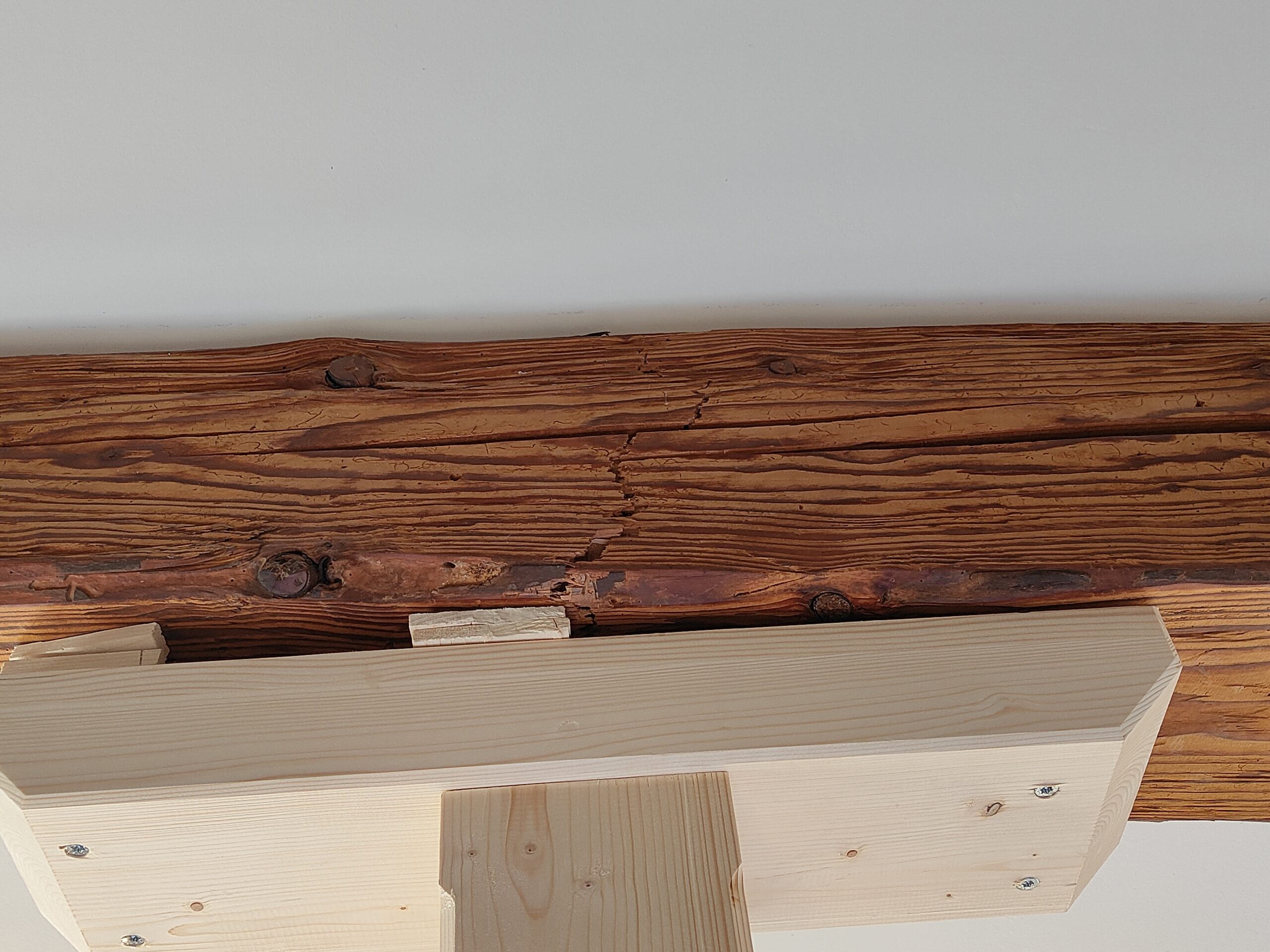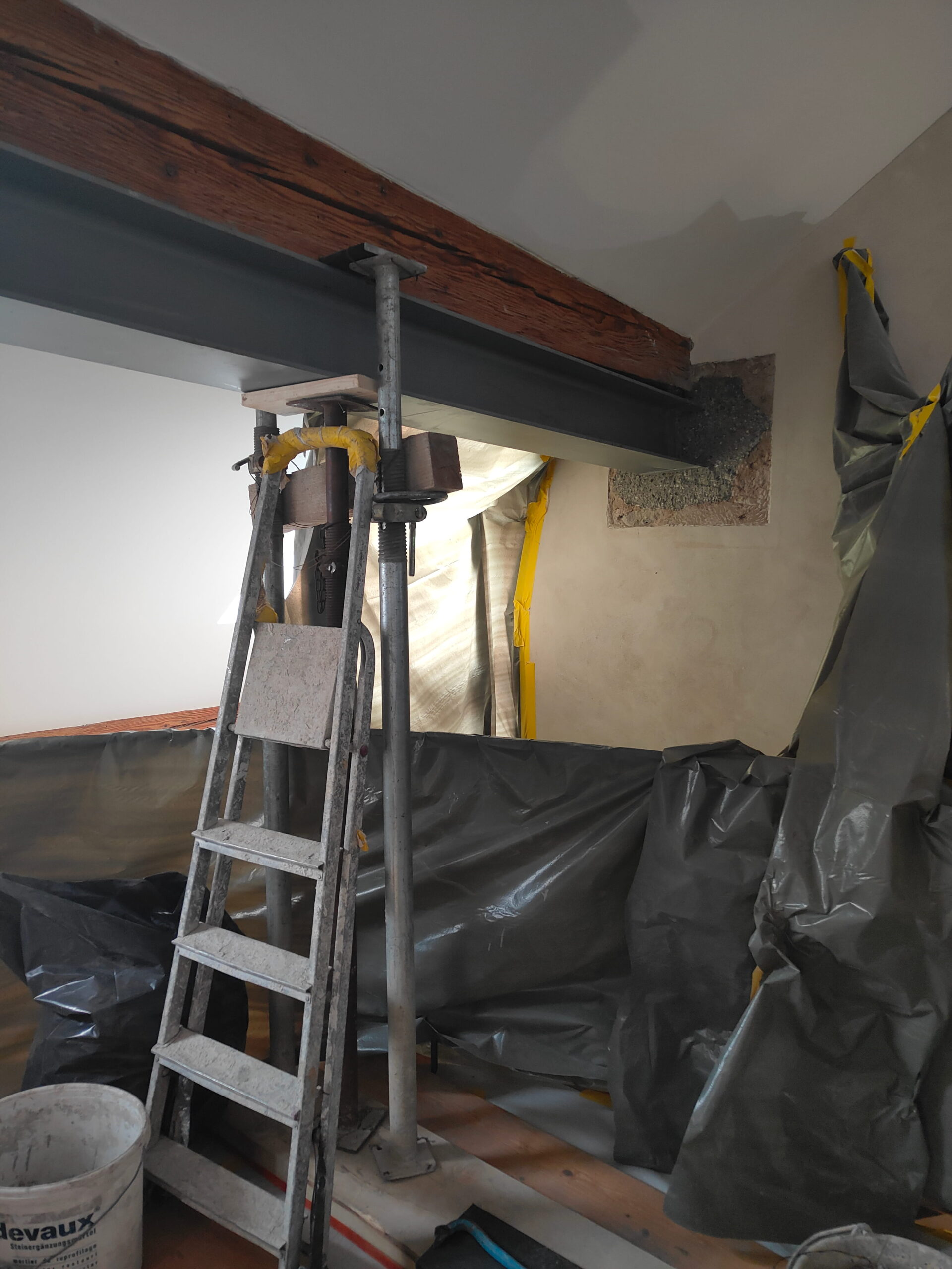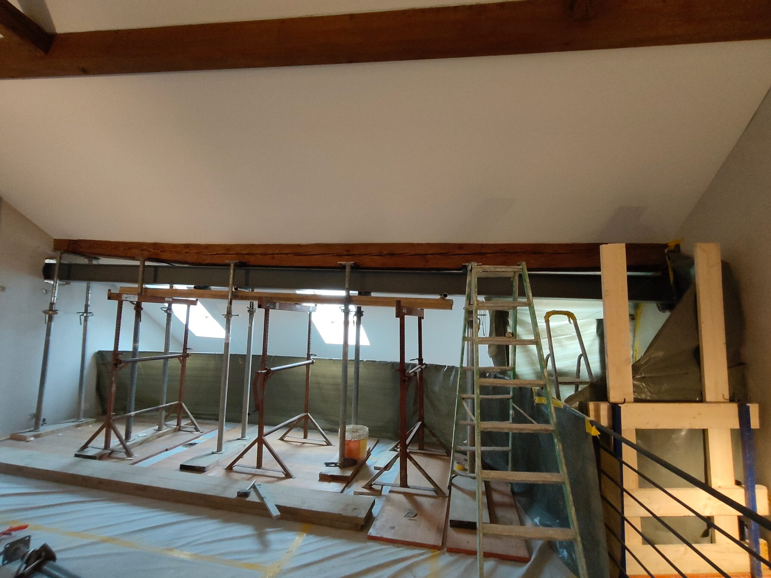 Le projet a consisté en l’ajout d’un profilé métallique sous la poutre en bois ayant rompu.