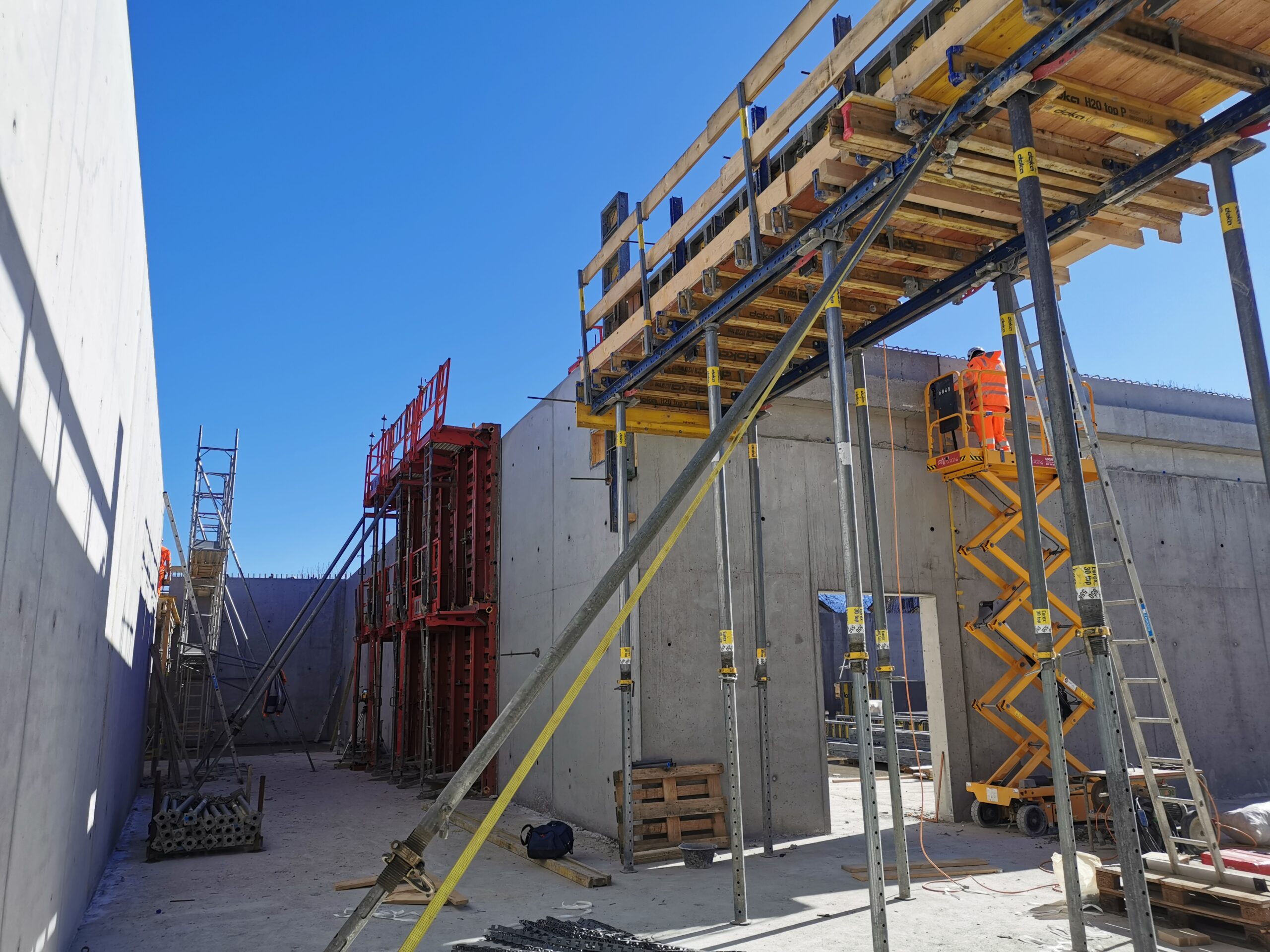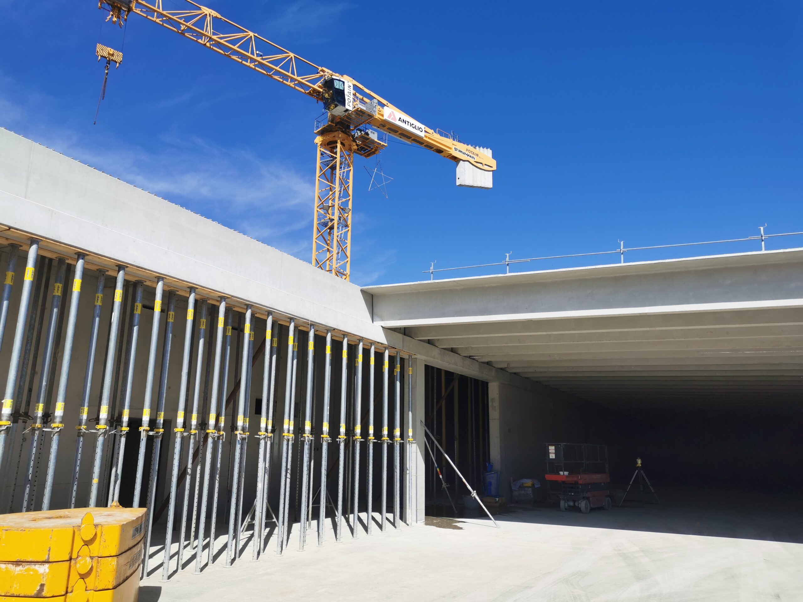 La structure portante de l’édifice a été réalisée à l’aide de poutres préfabriquées en béton précontraint, permettant de franchir des portées de plus de 20 mètres sans appuis intermédiaires. Cette solution technique a offert une grande liberté dans l’aménagement intérieur, en facilitant les flux de circulation et en optimisant la surface utile du magasin.